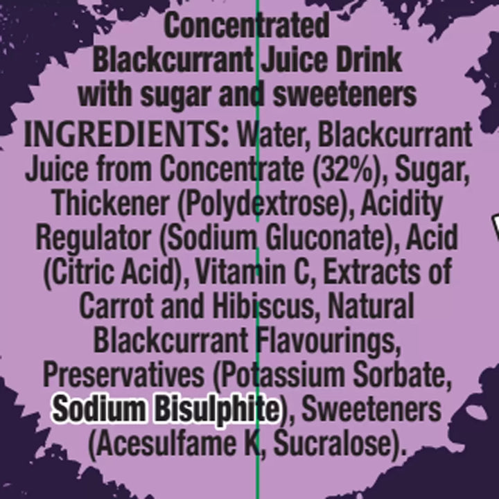 Since 1938, Ribena has been working with British farms, the birds and the bees to grow juicy blackcurrants. They are harvested at their freshest to ensure every glass of Ribena is deliciously fruity. Ribena Blackcurrant Squash is bursting with over 30% fruit juice and is rich in Vitamin C. Dilute 1 part (50ml) squash with at least 4 parts water to give a 250ml serving.