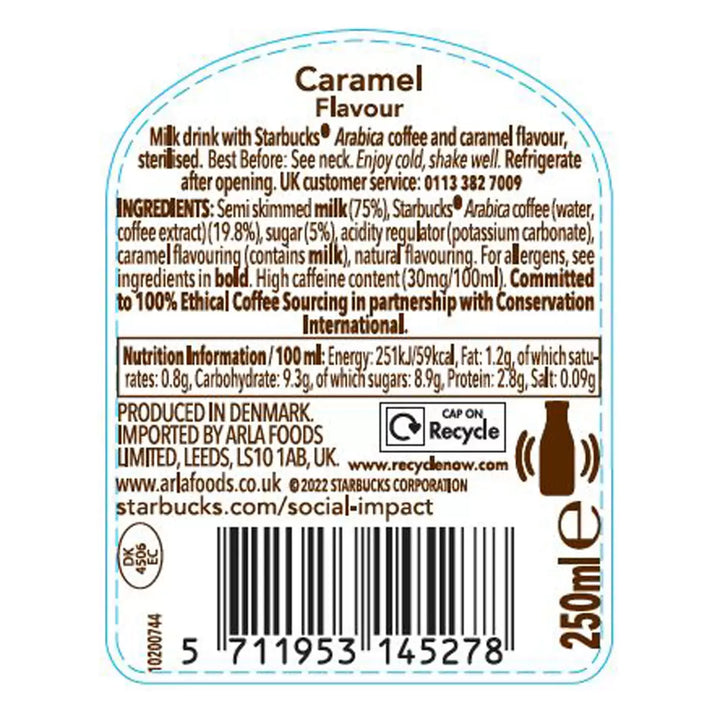 Starbucks Caramel Frappuccino Iced Coffee is inspired by a true Starbucks coffeehouse original. This frappuccino offers a delicious blend of Starbucks signature espresso roast coffee, creamy milk and buttery caramel. An indulgent chilled coffee blend, this is a perfect treat which can be consumed at home or on the go and is best served chilled, shaken and over ice. Starbucks coffees are made with 100% arabica coffee and verified as responsibly sourced by Coffee and Farmer Equity (C.A.F.E.) Practices.