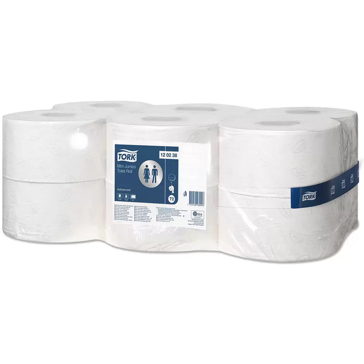 The Tork Mini Jumbo system stands for time efficiency and reduced cost, offering much more toilet paper than standard rolls. Tork Mini Jumbo Toilet Roll Advanced 2-ply balances cost and performance and is suitable for medium- to high-traffic locations.